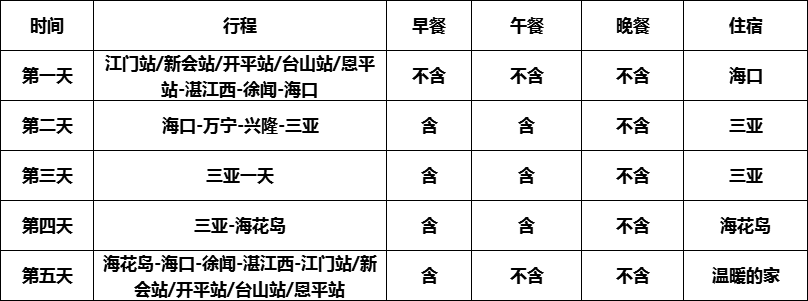 1.交通:江门五邑往返湛江西二等座动车票,湛江至海口往返轮渡船票,行程所列车费(根据人数选派相应的旅游车)。